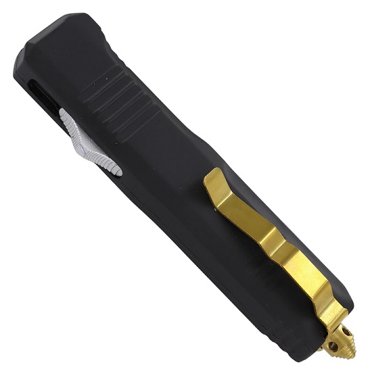 Damascus Ranger D/A OTF Black Automatic Knife Tanto. This exquisite automatic dual action out the front knife is sure to catch your eye. The blade is made from 1095/15N20 Steels to create a gorgeous wave-pattern Damascus. The blade features a ridge back design with 7 holes cut out to reduce weight and add a neat touch. When not in use, the blade is encased in the matte black zinc alloy handle. Use the silver switch on the side of the handle to deploy and retract the blade with ease. The six sturdy hex screws holding the handle together, as well as the trusty pocket clip and glass breaker on the handle are anodized for a gleaming golden finish. A black nylon sheath is included with a quick release closure. Overall Length: 9.5 inches, Blade Length: 3.75 inches