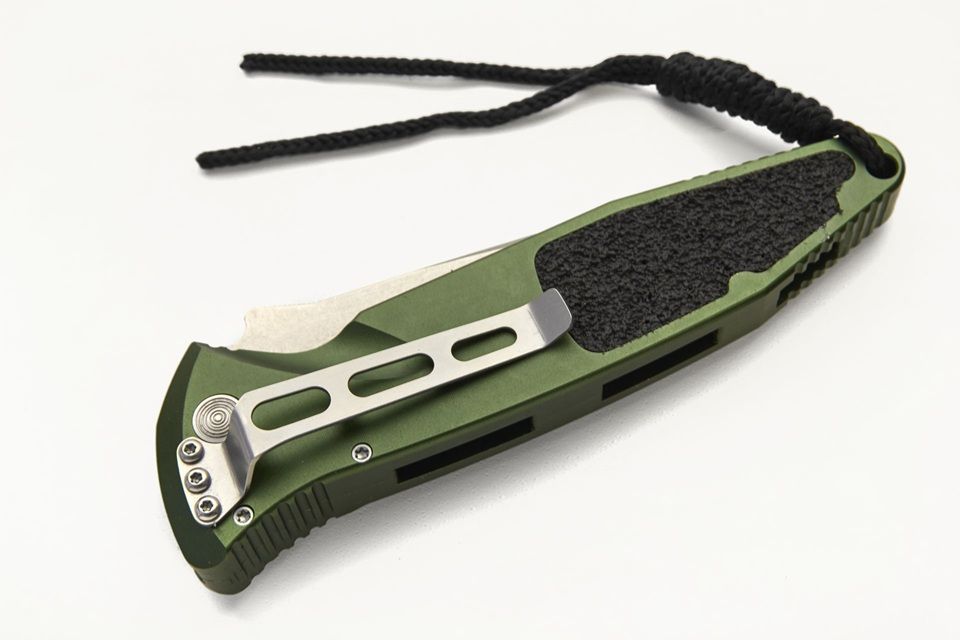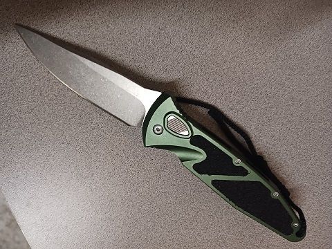 Dark Green Side Opening Automatic Knife Drop Point. Stonewashed 4 inch blade. 9 inches overall. Very well built with a hard snap when you push the button.