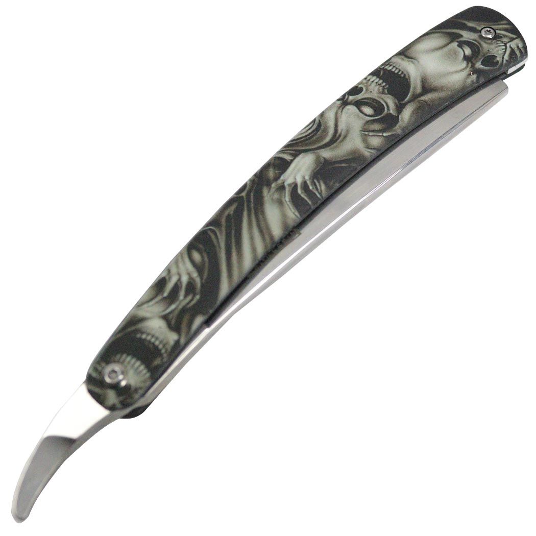 Defender Xtreme 10" Straight Razor Ghost Skulls. Great gift for all occasions or the ideal shaving tool whether you are at home or traveling. Brand new ergonomically designed straight cut razor, precision made to provide you with an extremely smooth traditional shave. This barber style open straight cut throat razor is very effect for achieving a close shave. The traditional style razor provides an exceptional quality shaving experience. 10" Overall Length 6" Handle Length 4" Blade Length Historical Flag Straight Razor Barber Style 3CR13 Stainless Steel Very effective Razor for the traditional shaving experience The ideal shaving tool for reducing shaving costs Precision made blade for easy sharpening and honing