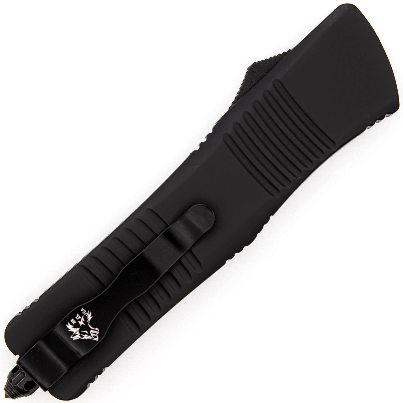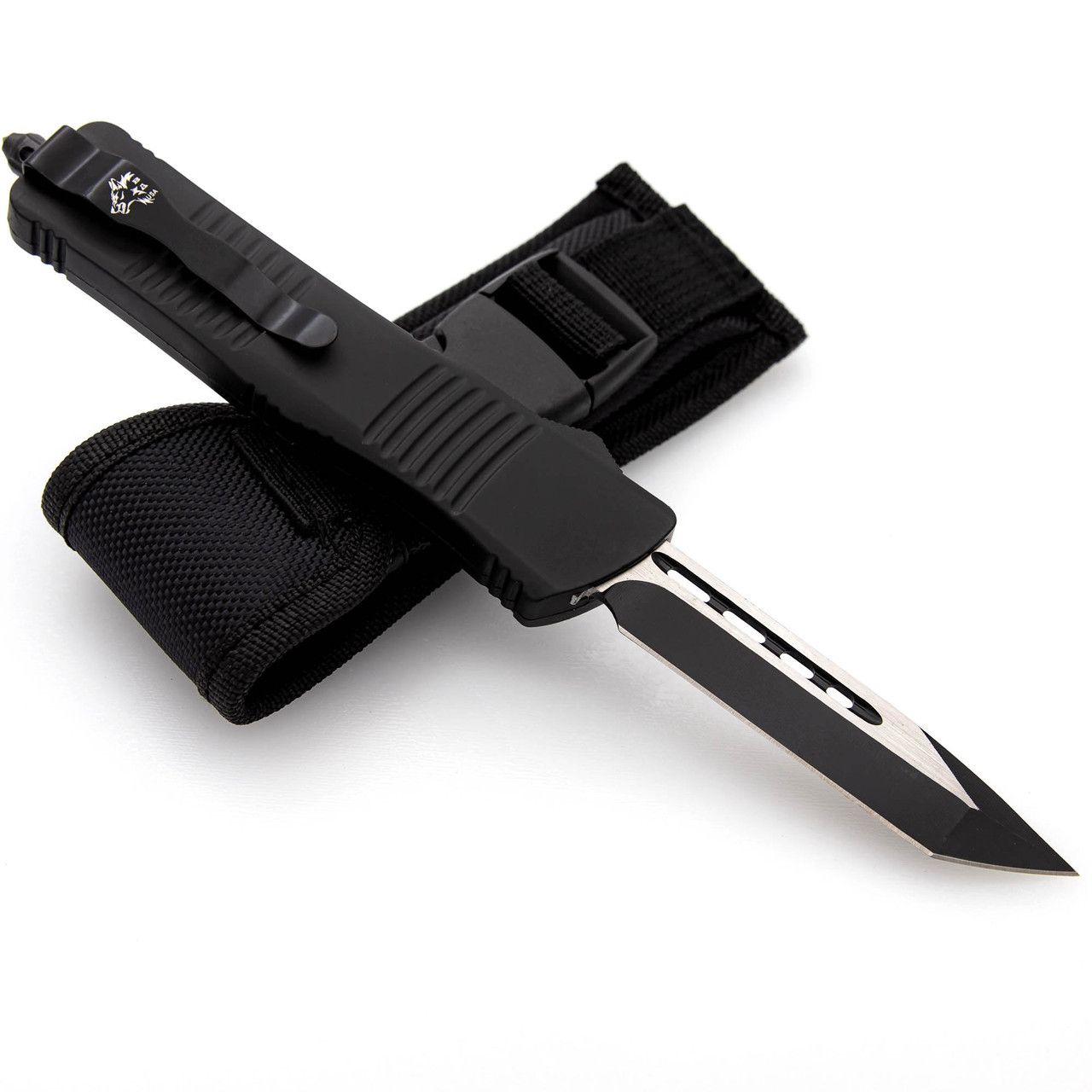 Delta Force OTF D/A Black Automatic Knife Tanto. This automatic Out The Front knife is made with a hefty handle casing for larger hands. The matte black handle is composed of zinc alloy and has a ribbed surface for an optimal grip. You can deploy and retract the blade effortlessly using the black switch located on the side of the handle. A black steel pocket clip and glass breaker give this knife an overall sleek appearance. The stainless-steel tanto style blade features a black and silver dual-tone finish and a central fuller with small holes punched out for weight reduction to create an agile weapon that can be drawn at a moment’s notice. Included with your purchase is a black nylon sheath that you can attach to your belt for easy carry. Overall Length: 9.5 Inches, Blade Length: 3.75 Inches