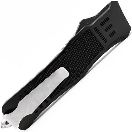 Delta Force Black OTF Autoswitch Knife Tanto Switchblade. The handle itself is made from durable zinc alloy and has a diamond textured finish for a firm hold even in the toughest weather conditions. A steel pocket clip and handy emergency glass breaker are featured on the handle. Overall Length: 9.5 inch, Blade Length: 3.75 inch