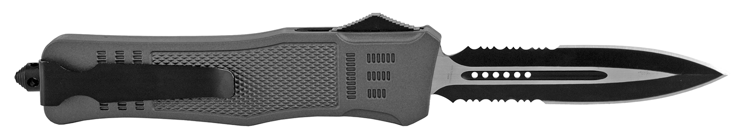 Delta Force Gray D/A OTF Automatic Knife Black Dagger Double Serrated. Blade Material 440 Stainless Steel Blade Type Serrated Folding Action Out the Front Handle Construction Stainless Steel Features Belt Clip, Glass Breaker, and Nylon Carrying Case Blade Length 3.75" Handle Length 5.75" Overall Length 9.5"