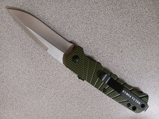 Delta Force Green Side Opening Automatic Knife Silver Drop Point. 3.5" bayonet blade 7.75 inches overall length with a pocket clip and safety switch. Heavy construction all metal handle.