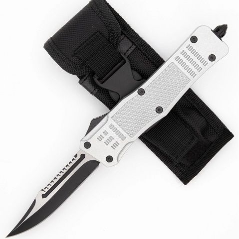 Delta Force Silver D/A OTF Automatic Knife Two Tone Drop Point Serrated Spine. Overall Length: 9.48 Inches Blade Length: 3.83 Inches Blade Width: 0.76 Inch Blade Thickness: 2.72 mm Blade Construction: Steel Handle Construction: Zinc Alloy Handle Length: 5.68 Inches Includes: Black Nylon Sheath