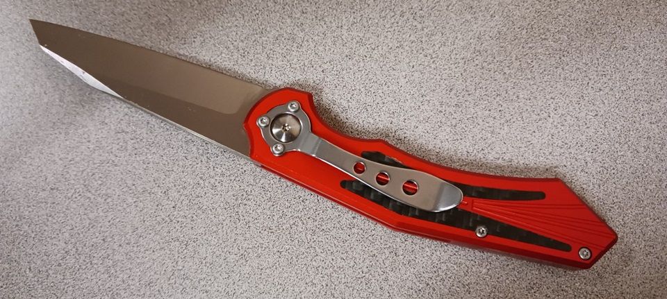 Diablo Automatic Knife Red Satin Plain. The Diablo is a side button folding automatic knife. It comes with carbon fiber inserts in the aluminum handle and a black Wharncliffe D2 steel blade. Has a sliding safety switch to prevent accidental discharge. overall length is 8.25 inches with a blade length of 3.5 inches. Comes with a pocket clip.