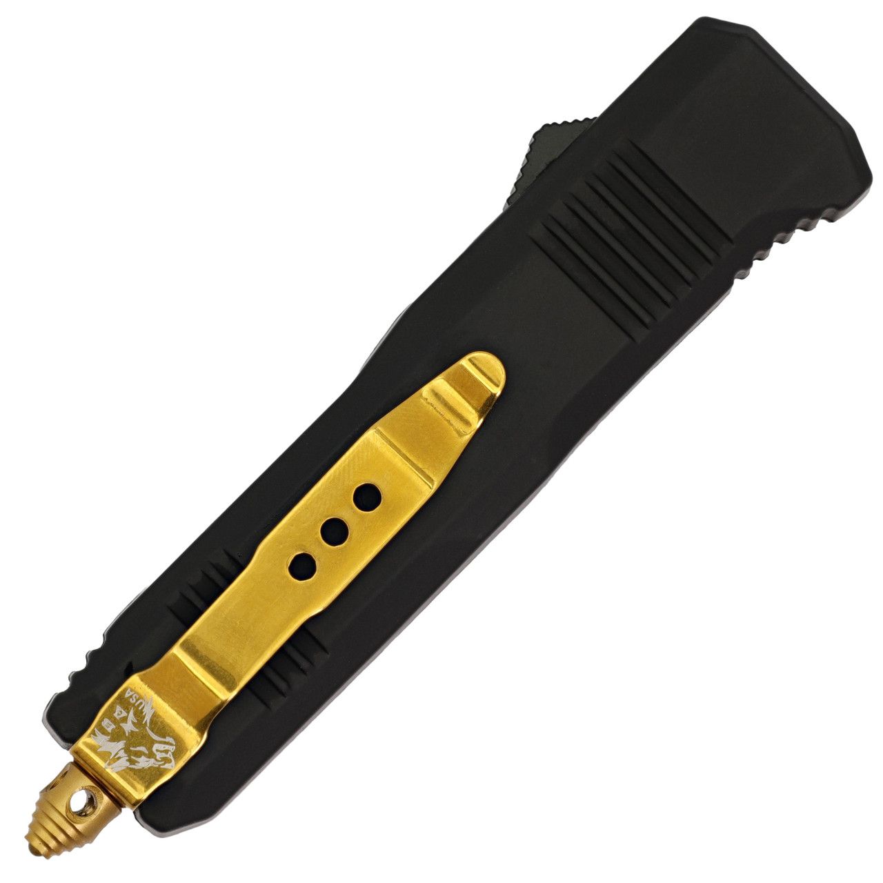 Evident Style Gold Damascus Steel Clip Point Out the Front OTF Knife w/ Golden Hardware Belt Clip Glass Breaker. It is the details that make an item truly unique and beautiful. Details that the Evident Style OTF is full of such as gold hardware, belt clip, and glass breaker that pop against the matte black handle. The blade is a clip point gold Damascus with a fuller on both sides of the blade as well as cutouts in the blade’s spine to lower and distribute weight more effectively. Included with the Evident Style Damascus is a nylon sheath equipped with a belt loop for easy carry. Overall Length: 7 Inches. Weight: 0.4 lbs.