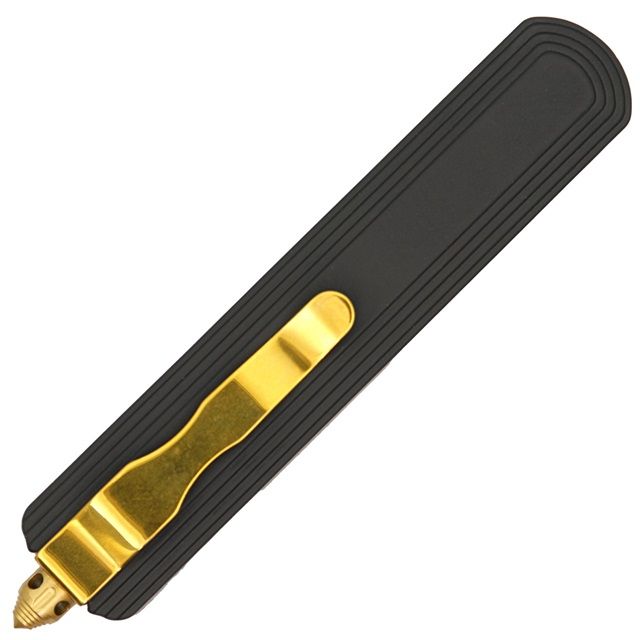 Extractor D/A OTF Black Automatic Knife Gold Tanto. is an out the front knife with a golden, tanto blade featuring a simulated damascus pattern which looks gorgeous no matter where the light hits it from. The handle has texturing along the edges for sure grip and features an easy-to-use centered switch. At the base of the handle is a belt clip and a glass breaker for convenience. Included is a nylon sheath for easy carry. Overall Length: 9.25 Inches. Weight: 0.75 lbs.