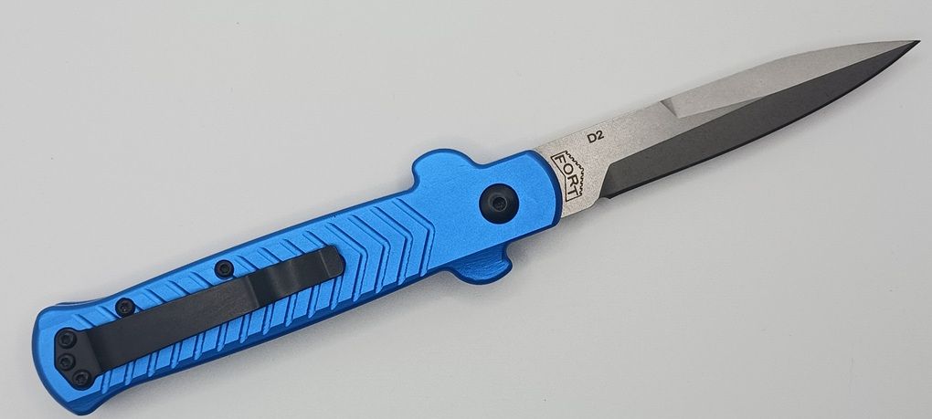 Fort Knife Works Arrow Blue Side Opening Automatic Knife D2 Satin Bayonet. The Fort Knife Works Arrow has an 4.25" Anodized 6048 aluminum body. D-2 Steel 3.25" Blade with Pocket clip and a Strong Spring. 7.75" overall length. Also included is a Zippered pouch. This knife is a first production run and is built very well. It is CNC machined and has a super smooth hard snap when you open it.