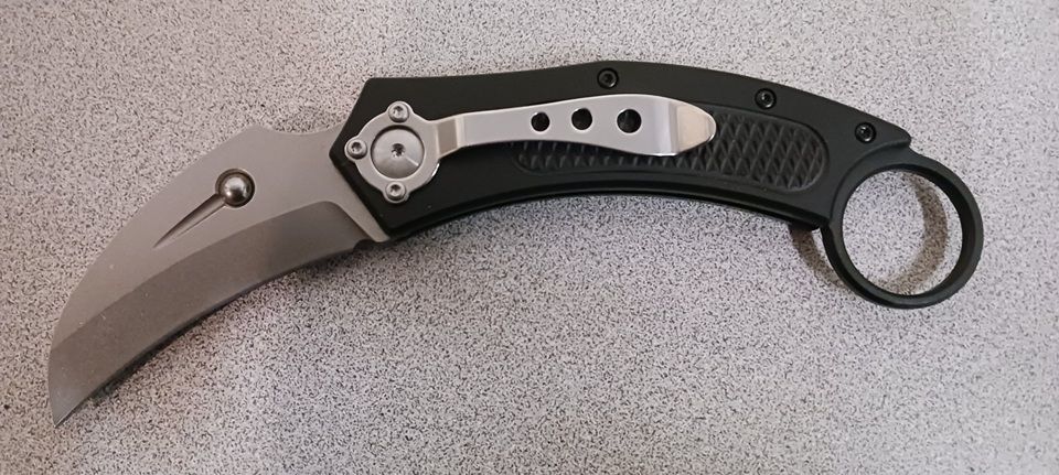 Fort Knife Works Auto Karambit Black Aluminum Handle Stonewash Hawkbill Blade. These knives are great for rescue situations, or cutting things like hay bail bindings. This knife is made in solingen germany. overall length of 7 inches with a 2.5" blade. Comes with a pocket clip for easy carry in your pocket.