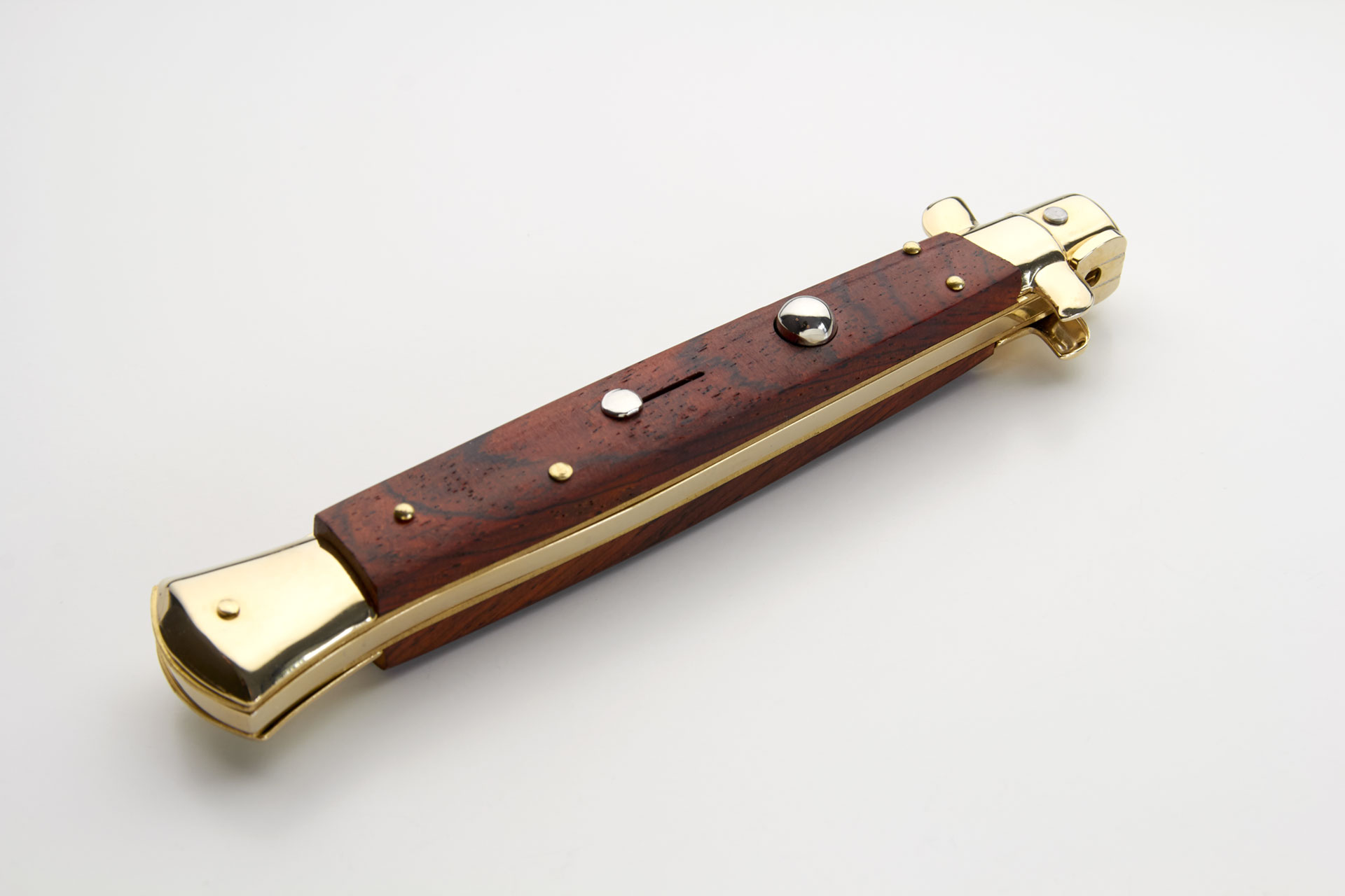 Frank Beltrame 11" Cocobolo Wood Italian Stiletto Automatic Knife Gold Bayo. Overall Length: 28cm -11" Blade Length: 12,5cm - 5" Blade thickness: 3mm - 0,12" Weight: 140 gr Blade material: AISI 420 Stainless steel Handle material: Rosewood Frame material: Brass Made in: Italy