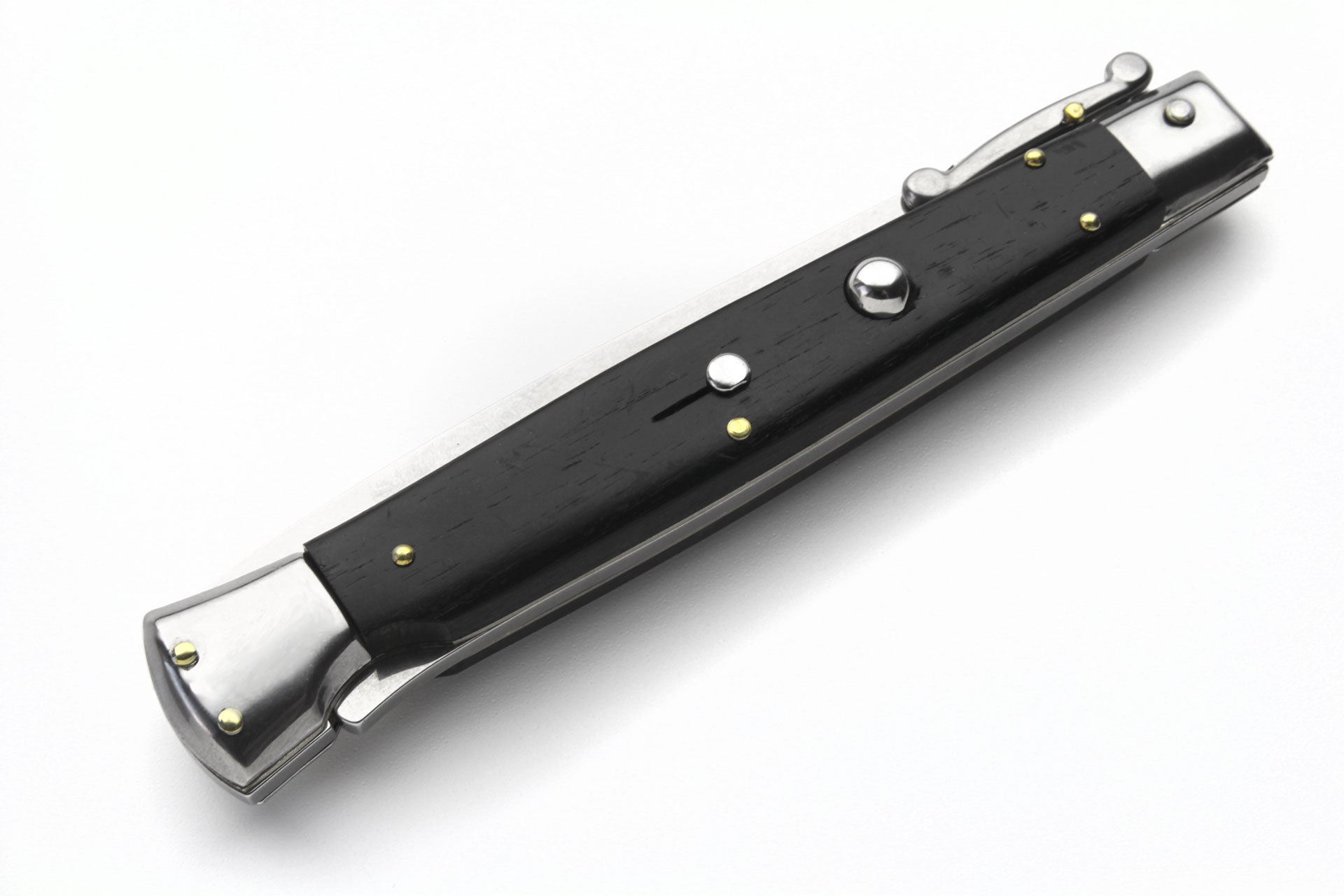 Frank Beltrame 11 Inch Ebony Wood Swinguard Stiletto Automatic Knife Satin Dagger. Overall Length: 28cm - 11" Blade Length: 12cm - 5" Blade thickness: 3,5mm - 0.14" Weight: 145 grBlade material: AISI 420 Stainless steel Handle material: Ebony Wood Frame material: Stainless steel Made in: Italy
