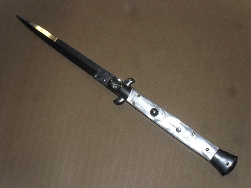 Frank Beltrame 11" Italian Stiletto Automatic Knife Imitation Pearl White Bayo. Overall Length: 28cm -11" Blade Length: 12,5cm - 5" Blade thickness: 3mm - 0,12" Weight: 140 gr Blade material: AISI 420 Stainless steel Handle material: Simulated Pearl Frame material: Brass Made in: Italy