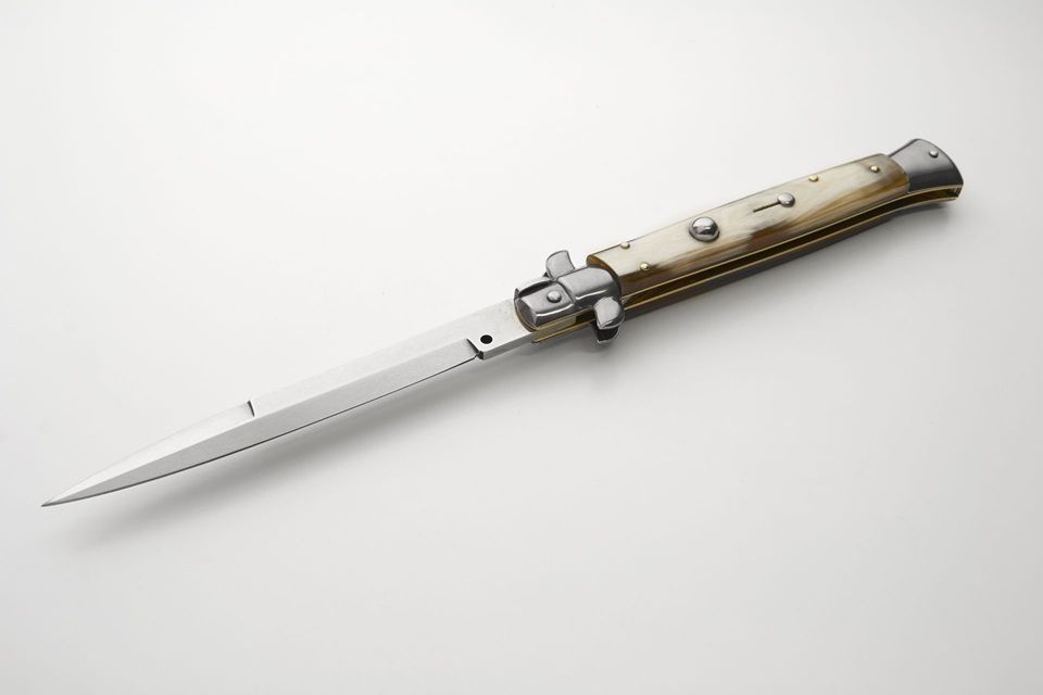Frank Beltrame 11" Italian Stiletto French Cow Horn Bayonet Automatic Knife. Overall Length: 28cm -11" Blade Length: 12,5cm - 5" Blade thickness: 3mm - 0,12" Weight: 140 gr Blade Material: AISI 420 Stainless steel Handle material: Imitation pearl Frame material: Brass Made in: Italy