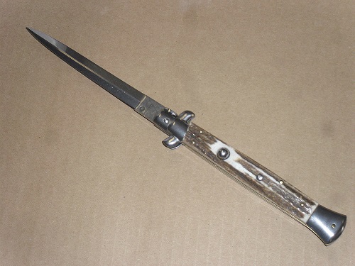 Frank Beltrame 11" Italian Stiletto Stag Horn Dagger Automatic Knife. Overall Length: 28cm -11" Blade Length: 12,5cm - 5" Blade thickness: 3mm - 0,12" Weight: 140 gr Blade material: AISI 420 Stainless steel Handle material: Genuine European stag Frame material: Brass Made in: Italy