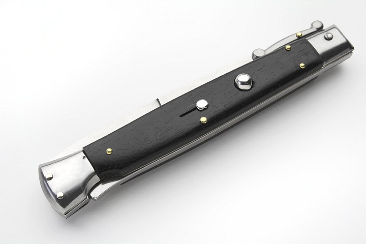 Frank Beltrame 11" Swinguard Stiletto Automatic Knife Ebony Wood Bayo 4mm. New from italy, they have changed to 4mm from 3.5mm. From now on all knives will have 4mm blade and springs. If you have any 3.5" models they are now collectors items. Overall Length: 28cm - 11" Blade Length: 12cm - 5" Blade thickness: 4mm Blade material: AISI 420 Stainless steel Handle material: Ebony Wood Frame material: Stainless steel Made in: Italy.