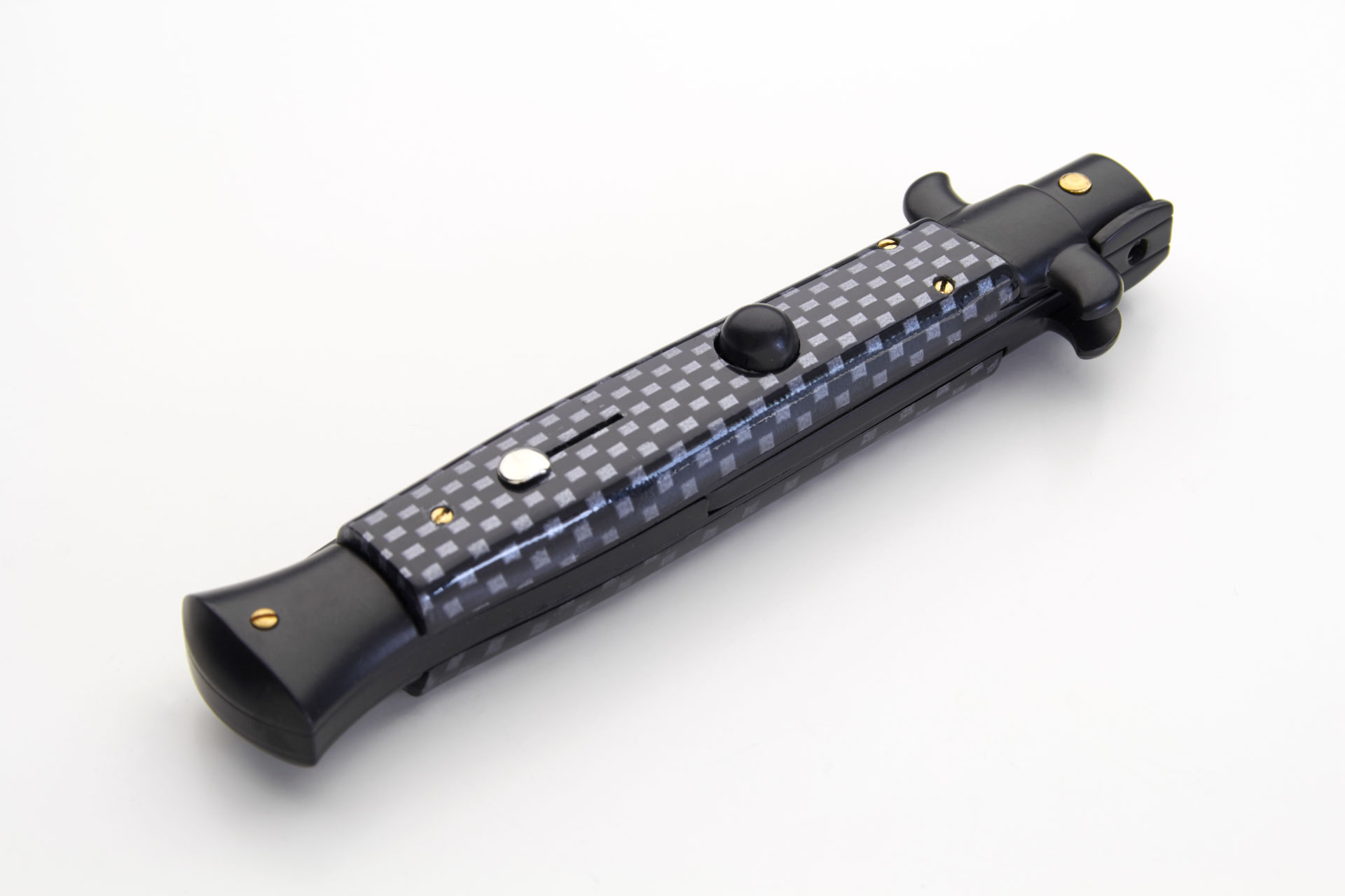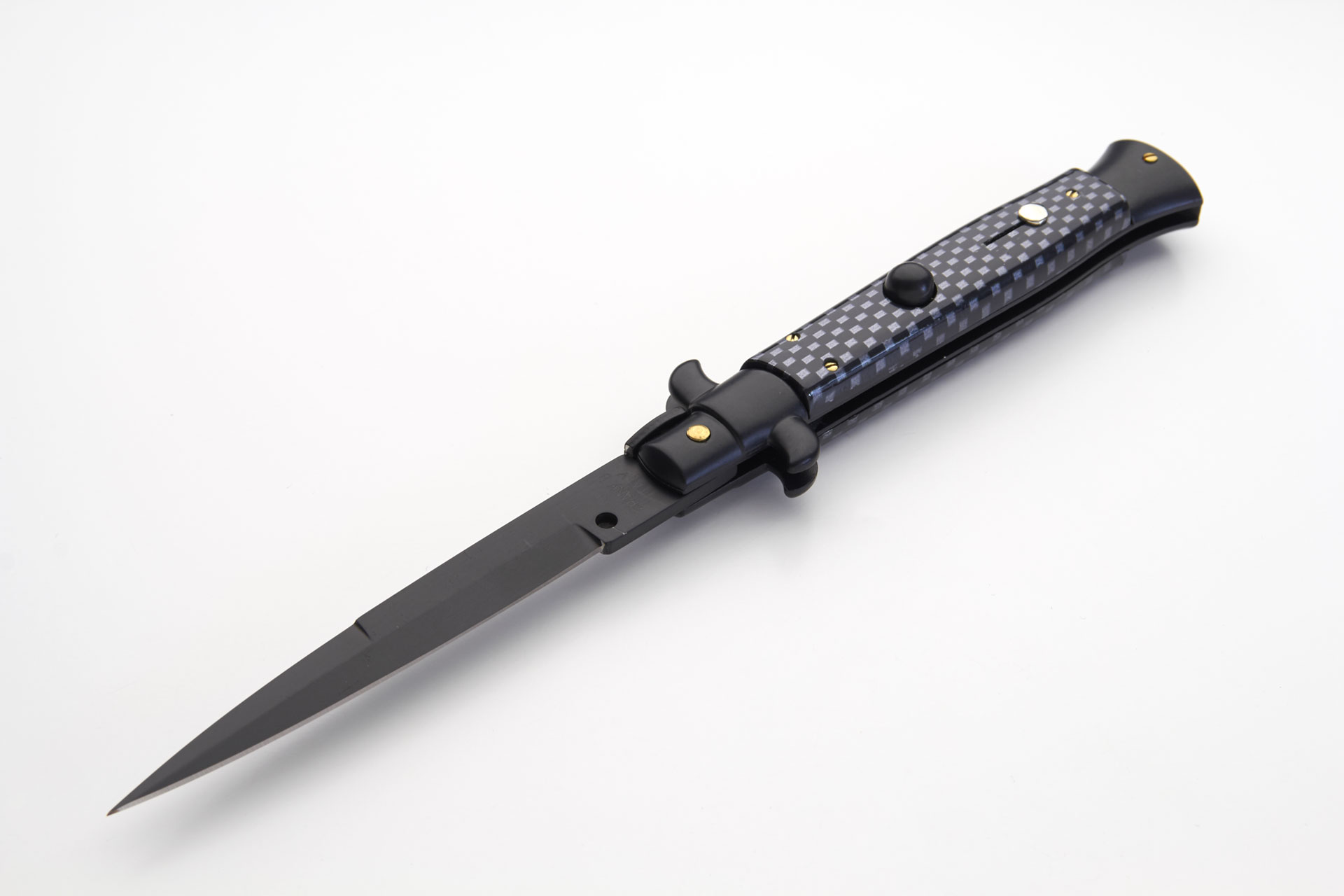 Frank Beltrame 9" Black Imitation Carbon Fiber Automatic Knife Black Bayo. Overall Length: 23cm - 9" Blade Length: 10cm - 4" Blade thickness: 3mm - 0.12" Weight: 110 gr Blade material: AISI 420 Stainless steel Handle material: Imitation carbon Fiber on aluminium Frame material: Stainless steel Made in: Italy