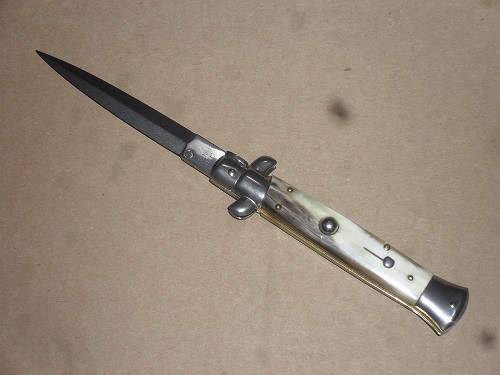 Frank Beltrame 9" Light Horn Stiletto Automatic Knife Dagger. Straight from Italy, all hand made knives. 440 stainless steel stamped frank b Italy on tang. Put together with brass pins and comes with a safety switch.Overall Length: 23cm - 9" Blade Length: 10cm - 4" Blade thickness: 3mm - 0.12" Weight: 110 gr Blade material: AISI 420 Stainless steel Handle material: Brazilian horn Frame material: Stainless steel Made in: Italy