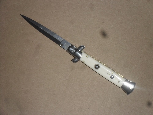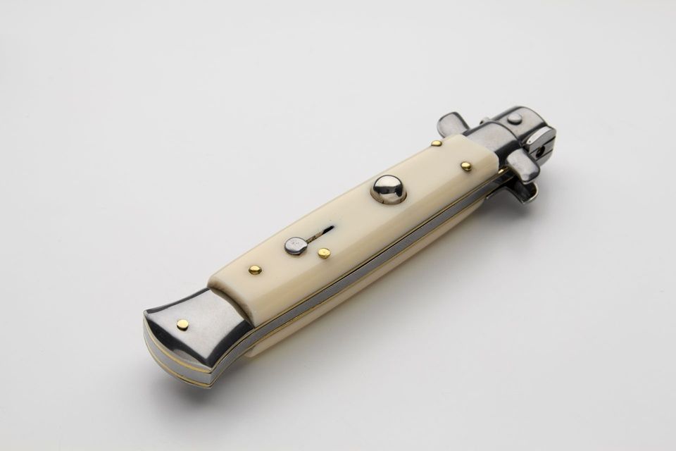 Frank Beltrame 9" Imitation Ivory Stiletto Automatic Knife Dagger. Straight from Italy, all hand made knives. 4 inch blade 440 stainless steel stamped frank b Italy on tang. Put together with brass pins and comes with a safety switch.