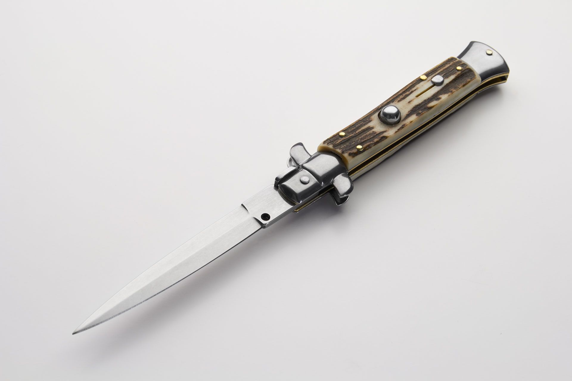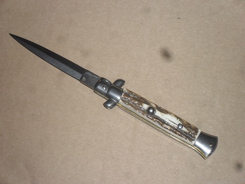 Frank Beltrame 9 Inch Stag Horn Stiletto Automatic Knife Dagger. A classic 9" stiletto switchblade made by Frank Beltrame. Genuine stag scales and dagger blade. The STILETTO classic. Always sexy, always attractive. This automatic knife is made in Italy by Frank Beltrame. Stainless steel bolsters release. Slide safety and very well made. Note: as it is a natural material, color, texture and pattern will vary from knife to knife. Overall Length: 23cm - 9" Blade Length: 10cm - 4" Blade thickness: 3mm - 0.12" Weight: 110 gr Blade material: AISI 420 Stainless steel Handle material: Genuine European stag Frame material: Stainless steel Made in: Italy
