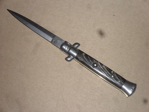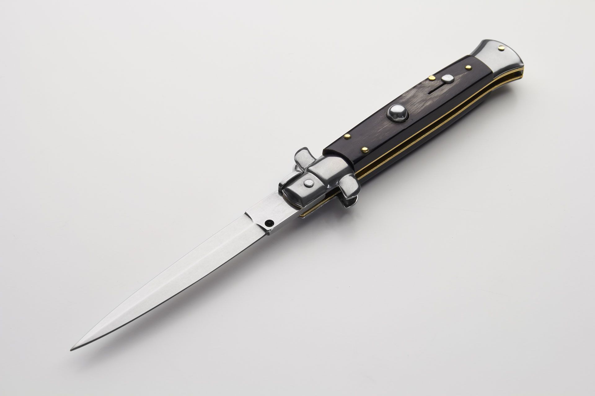 Frank Beltrame 9" Italian Stiletto Automatic Knife Dark Horn (4" Satin Dagger). A classic 9" stiletto switchblade made by Frank Beltrame. The STILETTO classic. Always sexy, always attractive. This automatic knife is made in Italy by Frank Beltrame. Stainless steel bolsters release. This one wears a Buffalo horn scales on a dagger blade. Slide safety and very well made. Note: as it is a natural material, color, texture and pattern will vary from knife to knife. Overall Length: 23cm - 9" Blade Length: 10cm - 4" Blade thickness: 3mm - 0.12" Weight: 110 gr Blade material: AISI 420 Stainless steel Handle material: Buffalo horn Frame material: Stainless steel Made in: Italy