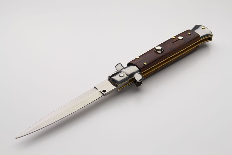 Frank Beltrame 9" Italian Stiletto Automatic Knife Red Heart Wood (4" Satin Dagger). A classic 9" stiletto switchblade made by Frank Beltrame. The STILETTO classic. Always sexy, always attractive. This automatic knife is made in Italy by Frank Beltrame. Stainless steel bolsters release. This one wears a Red Heart wood scales on a dagger blade. Slide safety and very well made. Note: as it is a natural material, color, texture and pattern will vary from knife to knife. Overall Length: 23cm - 9" Blade Length: 10cm - 4" Blade thickness: 3mm - 0.12" Weight: 110 gr Blade material: AISI 420 Stainless steel Handle material: Red Heart wood Frame material: Stainless steel Made in: Italy