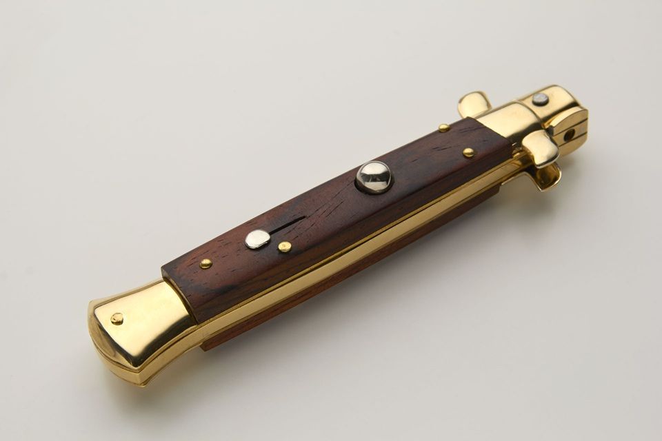 A beauty for who like the luxury. A classic 9" stiletto made by Frank Beltrame.Genuine red heart wood scales and bayonet blade. All parts are gold plated .The STILETTO classic. Always sexy, always attractive. Made in Italy by Frank Beltrame. Stainless steel bolsters release. Slide safety and very well made. Note: as it is a natural material, color, texture and pattern will vary from knife to knife. Overall Length: 23cm - 9" Blade Length: 10cm - 4" Blade thickness: 3mm - 0.12" Weight: 115 gr Blade material: AISI 420 Stainless steel Handle material: Red Heart wood Frame material: Stainless steel Made in: Italy