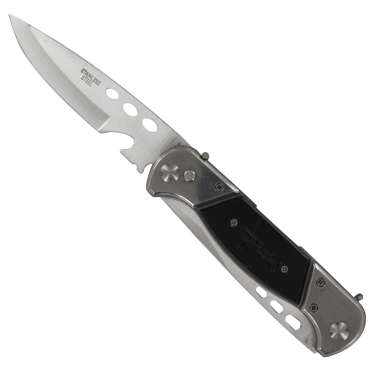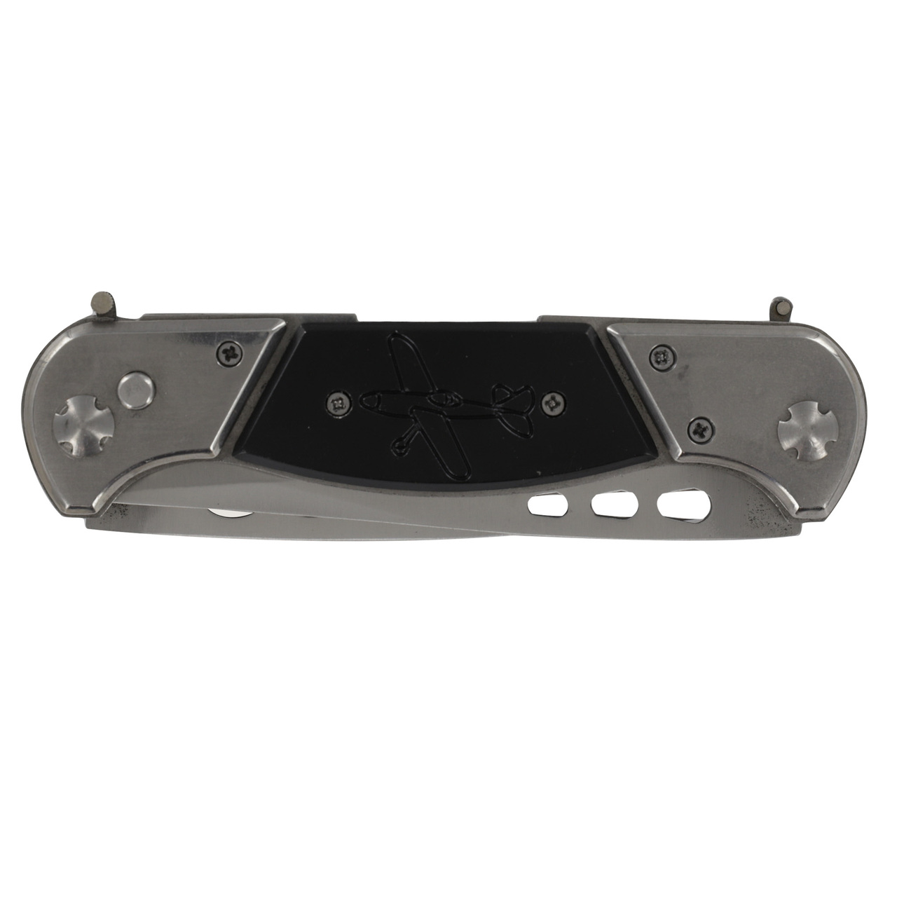 The handle features a double-walled steel construction and 2 sturdy black ABS mounts that depict a fighter plane on either side. A switch on the side of the handle is a locking mechanism to prevent accidental opening. Pushing the buttons on either side of the handle will open its corresponding blade. On one side is a lip point lade, and on the other is a traditional drop point. These blades are both made from sturdy stainless steel, and the drop point blade features a bottle opener is case of emergency. Included with your purchase is a free blade nylon sheath with belt loop so you can carry your new knife in style. Blade Length: Clip Point Blade: 4.25 inches, Drop Point Blade: 4.25 inches