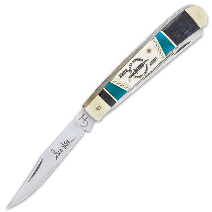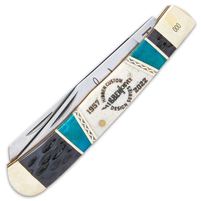The Hibben Knives 65th Anniversary Trapper Pocket Knife celebrates the artistry and innovation of knifemaker Gil Hibben and the success of Hibben Knives over the past 65 years. The razor-sharp blades are stainless steel and have Gil Hibben 65th Anniversary themed, laser-etched artwork. The handle scales are crafted of black jigged bone, teal acrylic and a white bone panel with the Hibben Knives logo. The collectible trapper pocket knife has nickel silver bolsters and is 4”, when closed.