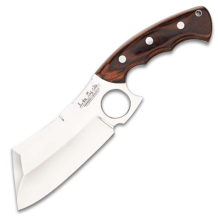 Gil Hibben Legacy Bloodwood Knife Cleaver. It is all about having supreme control from the finger-grooved handle that fits comfortably in your palm to the integrated finger ring The fixed blade has a 5 7/8”, full-tang 5Cr15MoV stainless steel cleaver blade with a mirror-polished finish and beveled edges The brownish red wooden handle scales are secured to the tang with heavy-duty stainless steel pins and there is a lanyard hole The 10 3/4” overall cleaver knife can be carried and stored in its premium black leather belt sheath, which has the Hibben Knives logo