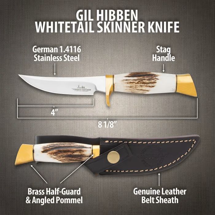 Gil Hibben Whitetail Skinner Knife and Sheath. Designed by legendary knifemaker and former Alaskan hunting guide Gil Hibben, the Whitetail Skinner Knife is built with a hunter’s instinct in mind. This expertly crafted fixed blade features a 4" trailing point blade made of German 1.4116 stainless steel, polished to a mirror finish and hardened to 56-58 HRC for edge retention and cutting efficiency. The genuine stag handle scales provide a secure grip and are paired with a polished brass half-guard and angled pommel, giving the knife a refined yet rugged look. At 8 1/8" overall, it offers the perfect balance of control and strength for skinning tasks. A premium leather belt sheath with detailed top-stitching completes this field-ready package. HIBBEN-DESIGNED: Created by master knifemaker and former Alaskan hunting guide Gil Hibben. TRAILING POINT BLADE: 4" German 1.4116 stainless steel with polished finish and 56-58 HRC. STAG HANDLE SCALES: Genuine stag grips paired with a brass half-guard and angled pommel. FIELD-READY SIZE: 8 1/8" overall length offers balance, control, and maneuverability. LEATHER BELT SHEATH: Premium sheath with top-stitching for secure carry and classic style.