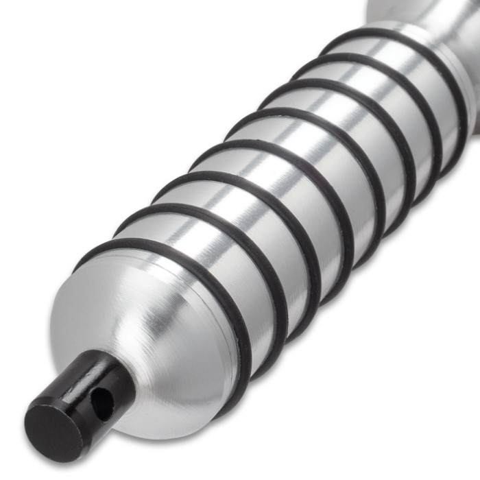 Grey Titanium Spiral Dagger Knife. A spiraling triumph of design, this quad-edged dagger is a powerful ally whenever things get down and really dirty It has a 11 1/2” grey titanium-coated, stainless steel, quad-edged blade with thru-holes and it spirals down to a piercing point The stainless steel handle has TPR rings to give you a slip-free grip and there is a hidden compartment in the pommel The 16 1/2” overall quad-edged knife comes in a custom-fit, tough TPU belt sheath, which also has steel lashing holes