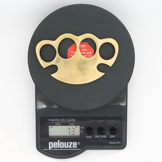 The Hard Stop Four Finger Paperweight 100% Brass Knuckle is a full four finger pure brass knuckle with 1 to 1.25 inch finger holes; the bigger finger holes are in the middle and the 1 inch ones are on either side to ensure a snug grip. The base of the knuckle is rounded for comfortability in the palm. The business end of the knuckle is rounded above the finger holes to grant farther reach in use. The Hard Stop Four Finger Paperweight 100% Brass Knuckle features a natural golden shine due to the brass so it would also make a gorgeous and useful addition to your home décor. Overall Length: 4.63 Inches. Weight: 0.3 lbs./ 136.1 g.