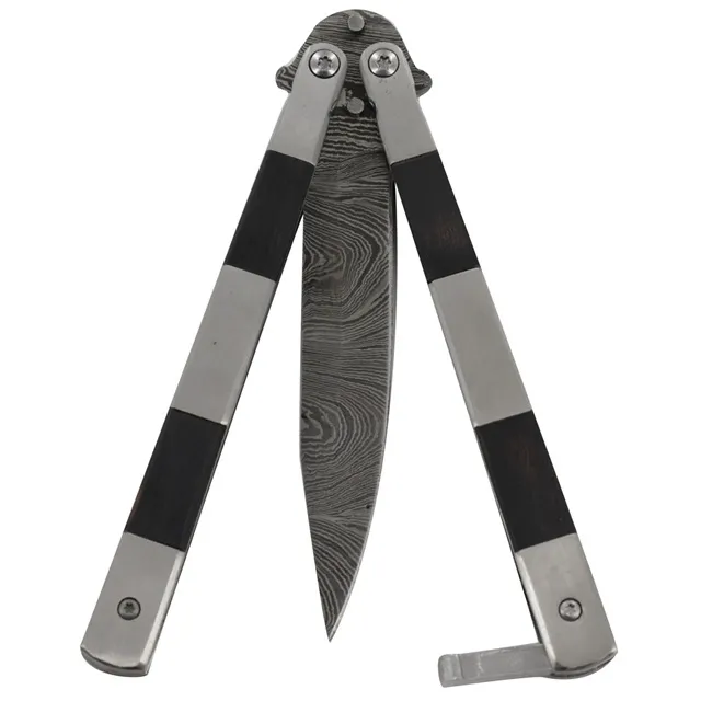 Horror Show Damascus Steel Heavy Duty Fanning Butterfly Knife. Damascus steel is characterized by distinctive patterns of banding and mottling reminiscent of flowing water. Not only is it beautiful, but it is also valued because of its ability to maintain a keen edge yet is also hard and flexible. The blade of this particular butterfly knife is made from Damascus steel in a drop point style. It’s made from 1095/15N20 alloy steel. A billet is forged, hammered, and heated so that a pattern shows on the blade. The HRC is around 54 to 55 with 180 true blade layers. This knife also features double tang pins meant to hold the blade away from the handle when closed to prevent dulling and another pin to keep the handles from excessively banging together while the butterfly knife is being manipulated. This eye-catching blade is a very unique piece to your collection. Overall Length: 8.75 Inches, Blade Length: 4 Inches
