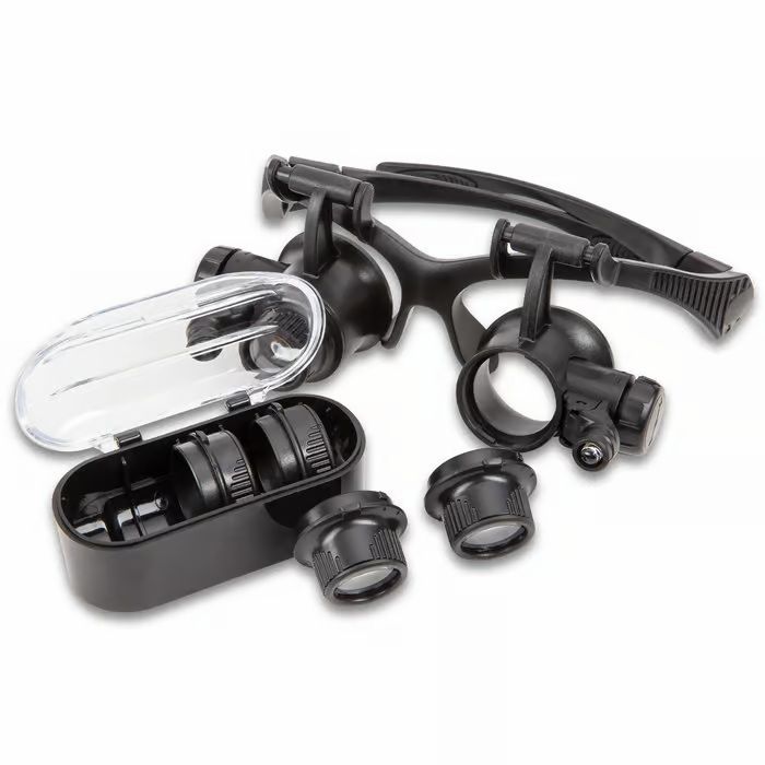 The Illuminated Hands-Free Dual Loupe has unlimited uses for your home or office, your hobbies and for finely detailed work. Mounted on a plastic glasses frame, the loupe easily pivots and slides and has a comfortable, swappable elastic band. A super bright white LED light ensures that you have a fully-illuminated view of whatever you’re looking at or working on. Two sets of four interchangeable acrylic lenses offer magnifications of 10x, 15x, 20x and 25x. Three AG10 batteries (included) are required for each loupe and a plastic storage case is included for the loupes. This hands-free dual loupe has unlimited uses for your home or office, your hobbies and for finely detailed work Mounted on a plastic glasses frame, the loupe easily pivots and slides and has a comfortable, swappable elastic band A super bright white LED light ensures that you have a fully-illuminated view of whatever you’re looking at or working on Two sets of four interchangeable acrylic lenses offer magnifications of 10x, 15x, 20x and 25x Three AG10 batteries (included) are required for each loupe and a plastic storage case is included for the loupes