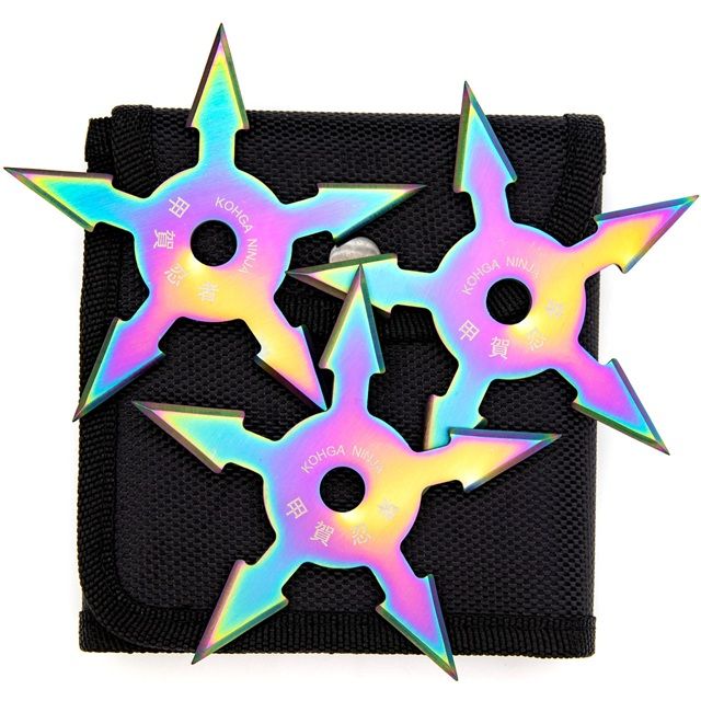 Khoga Ninja Set of 3 Sure Stick Five Point Shuriken Throwing Stars Titanium. Specifications: Overall Diameter: 4 Inches Blade Length: 1 Inch Points: 5 Star Material: 440 Stainless Steel Includes: 3 Shuriken, Black Nylon Pouch w/ Belt Loop Features: Durable 440 Stainless Steel Construction Set of Three High-Quality Throwing Stars Includes Free Nylon Pouch with Belt Loop Available in Multiple Color Options