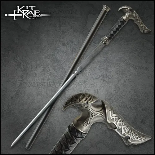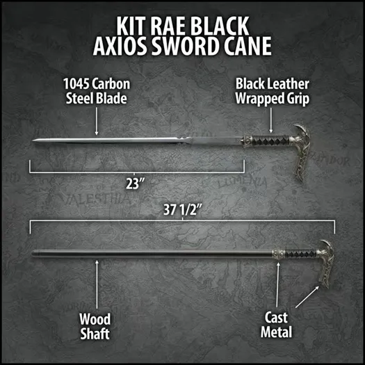 The Kit Rae Black Axios Sword Cane is a striking fusion of fantasy artistry and meticulous craftsmanship, designed by legendary weapon creator Kit Rae. This elegant yet bold piece features a 23-inch 1045 carbon steel blade with a black oxide finish, accentuated by intricate scrollwork etchings. Hidden within a sleek wooden shaft, the blade is effortlessly released with a concealed button mechanism, making it a stunning display piece with an air of mystique. Crafted for both form and presence, the blackened cast metal fittings and scroll-worked handle enhance the cane’s refined aesthetic. The black leather-wrapped grip over faux rayskin follows a Samurai-inspired design, ensuring a secure and stylish hold. Whether displayed in a collection or carried as a striking statement accessory, the Black Axios Sword Cane stands as a testament to Kit Rae’s iconic craftsmanship and attention to detail. LEGENDARY DESIGN: Created by renowned artist Kit Rae, known for his fantasy weaponry and masterful designs. EXCEPTIONAL BLADE QUALITY: Features a 23” 1045 carbon steel blade with a black oxide finish and intricate scrollwork etchings. DISCREET AND ACCESSIBLE: A hidden button mechanism allows for quick blade release from its secure locking system. ELEGANT HANDLE AND SHAFT: Blackened cast metal fittings and a scroll-worked handle complement the sturdy wooden shaft with a hard rubber toe. EXPERT CRAFTSMANSHIP: Handle wrapped in black leather over faux rayskin, inspired by Samurai aesthetics for a refined grip.