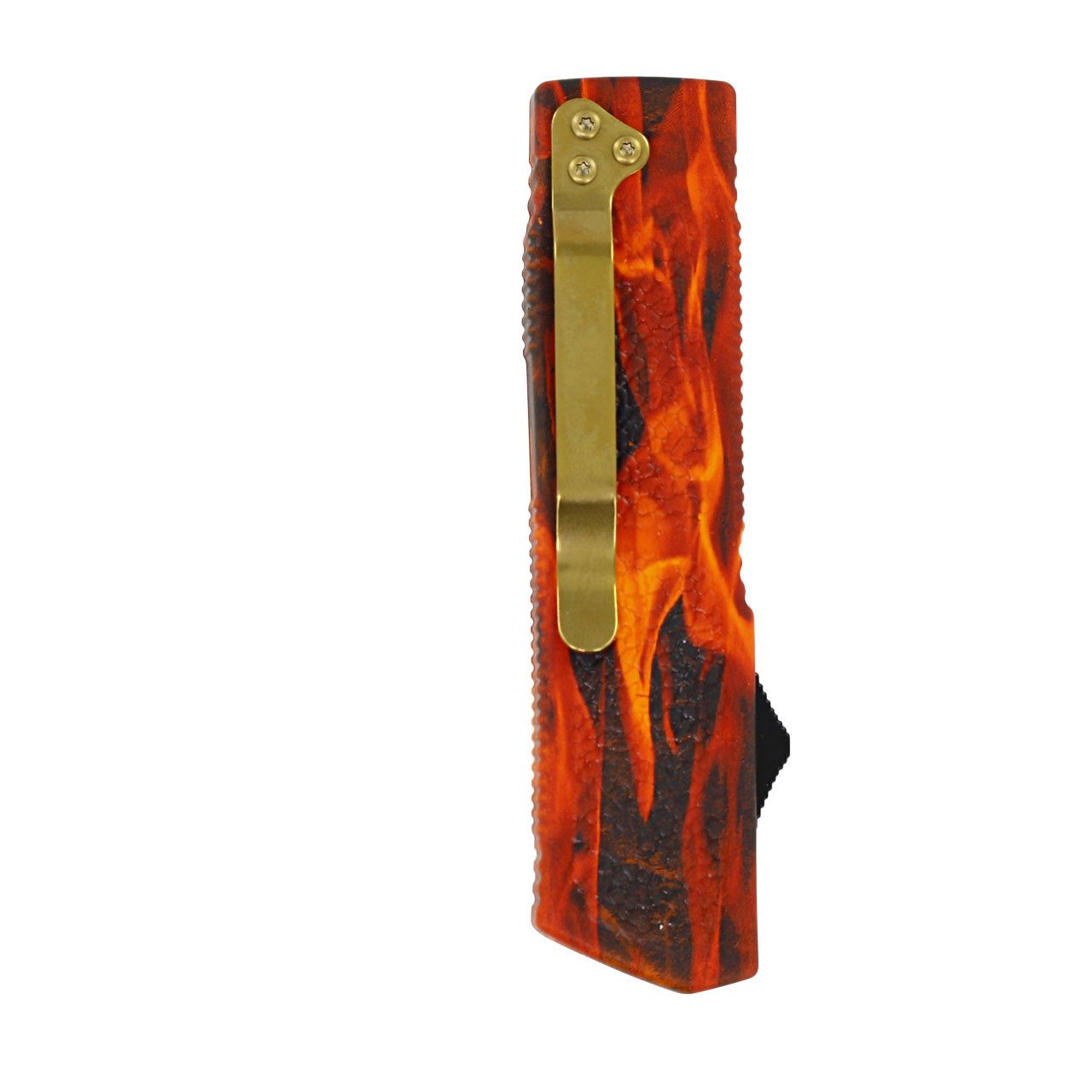 Lightning Elite Fire D/A OTF Automatic Knife Gold Tanto. Specifications: Overall Length: 7.9 Inches Overall Width: 1.7 Inches Blade Length: 3.2 Inches Blade Thickness: 0.7 Inches Handle Length: 4.7 Inches Handle Width: 1.7 Inches Handle Thickness: 1.1 Inches Features: Gold Tanto Blade with Etched Design Fire-Coated Handle with Non-Slip Grip Matching Gold Screws and Pocket Clip Black Nylon Pouch Included