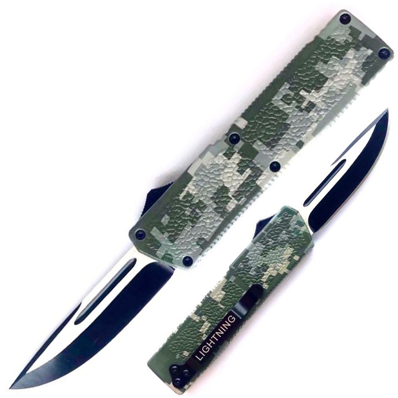 Lightning Model 2 Camo D/A OTF Automatic Knife Two Tone Drop Point. Aerospace Grade Aircraft Aluminum Handle 440 Stainless Steel Blade Deep Carry Pocket Clip. 8 inch total length 3.25 inch blade. Strong spring dual action snap with the push of the button forward and backward