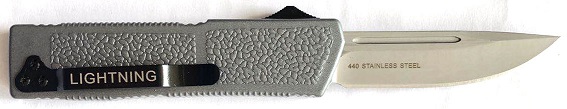 Lightning Model 2 Gray D/A OTF Automatic Knife Satin Drop Point. Space Grade Aircraft Aluminum Handle 440 Stainless Steel Blade Deep Carry Pocket Clip. 8 inch total length 3.25 inch blade. Strong spring dual action snap with the push of the button forward and backward