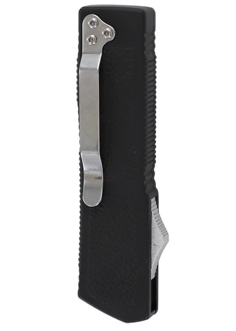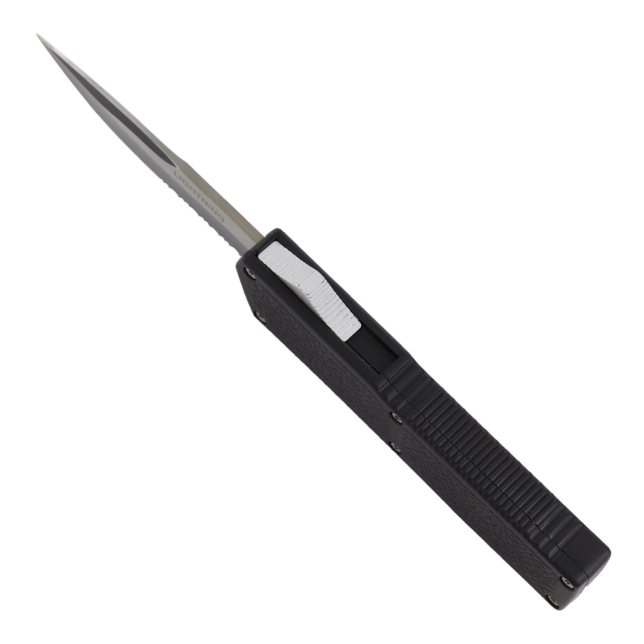 Lightning Model 3 Black D/A OTF Automatic Knife Two Tone Drop Point Serrated. Features: Heavy Duty Automatic Dual Action Out the Front Blade Material: Stainless Steel Drop Point Serrated Style Two-Toned Finish Handle Material: Zinc Alloy; Matte Black Textured Grip Silver Pocket/Belt Clip Firing Button Specifications: Overall Length: 7.85 Inches Blade Length: 3.25 Inches Handle Length: 4.55 Inches