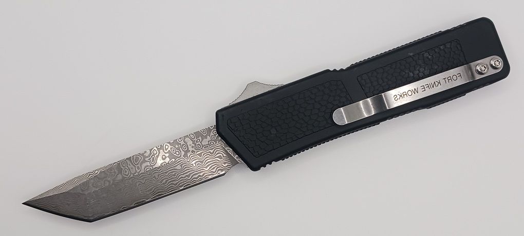 Lightning Supreme Black D/A OTF Automatic Knife Damascus Tanto Point. The Black Lightning Supreme has an 8 inch total length with a 3.25 inch blade. It is a double action in and out switchblade knife. This is a taiwan version. The taiwan version was the first produced before the chinese versions came out. This version has aircraft aluminum handles and better made metal blades. The springs in these are made better and stronger than the chinese versions. It comes with a pocket clip which can be taken off.
