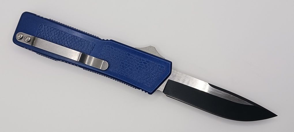Lightning Supreme Blue D/A OTF Automatic Knife Black Drop Point Two Tone. The Blue Lightning Supreme has an 8 inch total length with a 3.25 inch blade. It is a double action in and out switchblade knife. This is a taiwan version. The taiwan version was the first produced before the chinese versions came out. This version has aircraft aluminum handles and better made metal blades. The springs in these are made better than the chinese versions. It comes with a pocket clip which can be taken off.