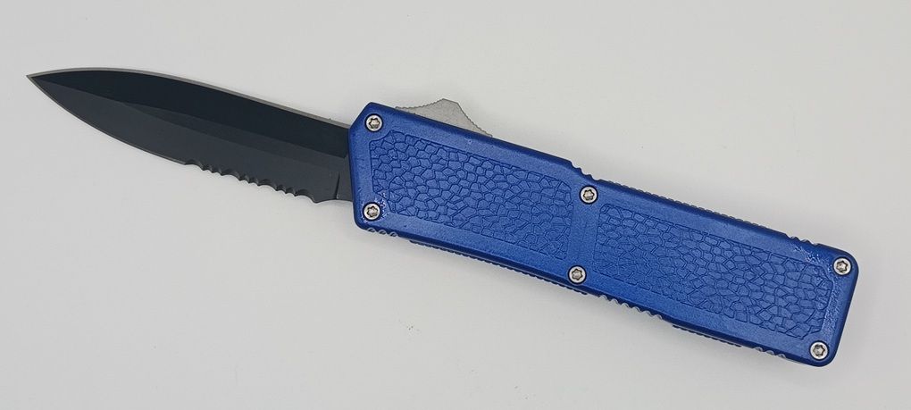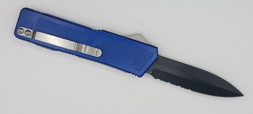 Lightning Supreme Blue D/A OTF Automatic Knife Dagger Point Black Serrated. The Blue Lightning Supreme has an 8 inch total length with a 3.25 inch blade. It is a double action in and out switchblade knife. This is a taiwan version. The taiwan version was the first produced before the chinese versions came out. This version has aircraft aluminum handles and better made metal blades. The springs in these are made better than the chinese versions. It comes with a pocket clip which can be taken off.