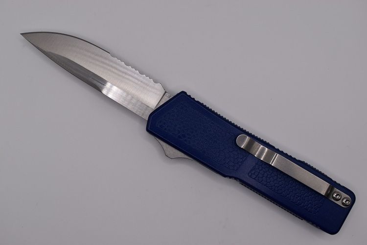 Lightning Supreme Blue D/A OTF Automatic Knife Drop Point Satin Serrated. The Blue Lightning Supreme has an 8 inch total length with a 3.25 inch blade. It is a double action in and out switchblade knife. This is a taiwan version. The taiwan version was the first produced before the chinese versions came out. This version has aircraft aluminum handles and better made metal blades. The springs in these are made better than the chinese versions. It comes with a pocket clip which can be taken off.