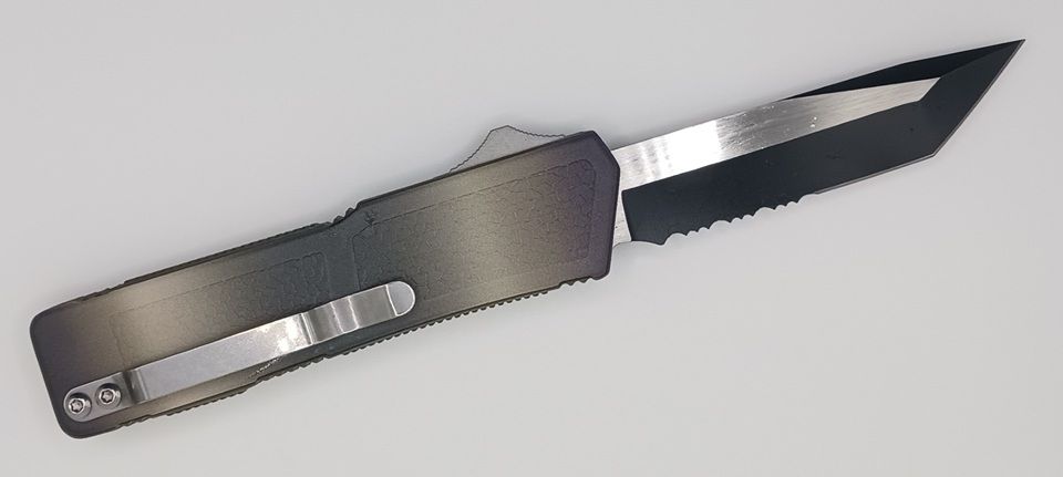 Lightning Supreme Camo D/A OTF Automatic Knife Tanto Point Black Plain. The Camo Lightning Supreme has an 8 inch total length with a 3.25 inch blade. It is a double action in and out switchblade knife. This is a taiwan version. The taiwan version was the first produced before the chinese versions came out. This version has aircraft aluminum handles and better made metal blades. The springs in these are better made than the chinese versions. It comes with a pocket clip which can be taken off.