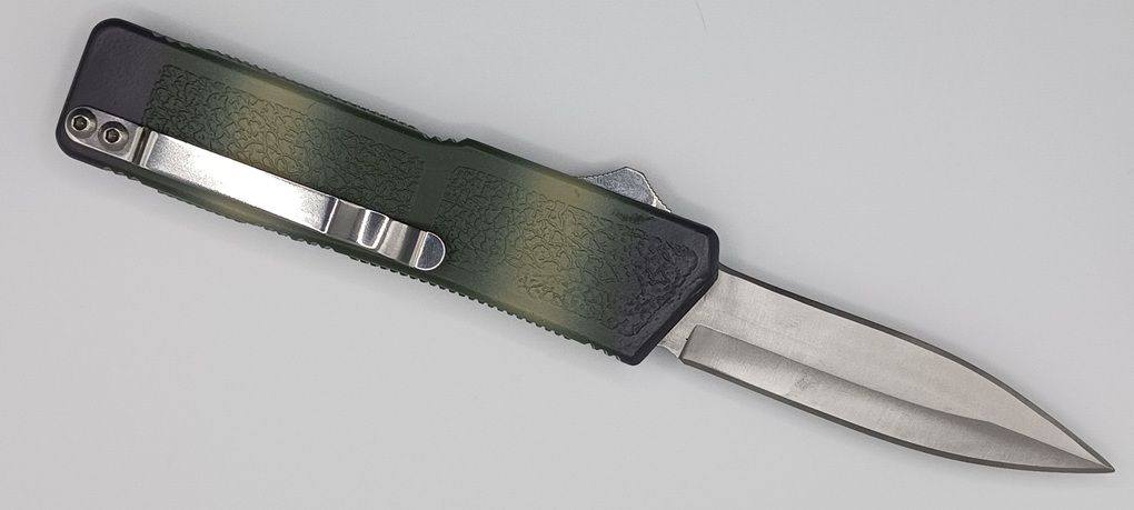 Lightning Supreme Camouflage D/A OTF Automatic Knife Dagger Point Satin Plain. The Camouflage Lightning Supreme has an 8 inch total length with a 3.25 inch blade. It is a double action in and out switchblade knife. This is a taiwan version. The taiwan version was the first produced before the chinese versions came out. This version has aircraft aluminum handles and better made metal blades. The springs in these are made better than the chinese versions. It comes with a pocket clip which can be taken off.