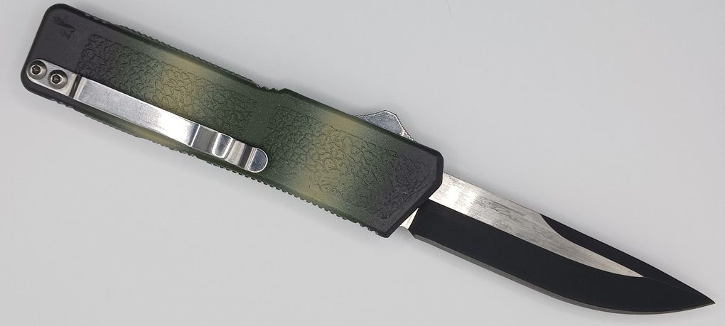 Lightning Supreme Camouflage D/A OTF Automatic Knife Drop Point Two Tone Plain. The Camouflage Lightning Supreme has an 8 inch total length with a 3.25 inch blade. It is a double action in and out switchblade knife. This is a taiwan version. The taiwan version was the first produced before the chinese versions came out. This version has aircraft aluminum handles and better made metal blades. The springs in these are made better than the chinese versions. It comes with a pocket clip which can be taken off.