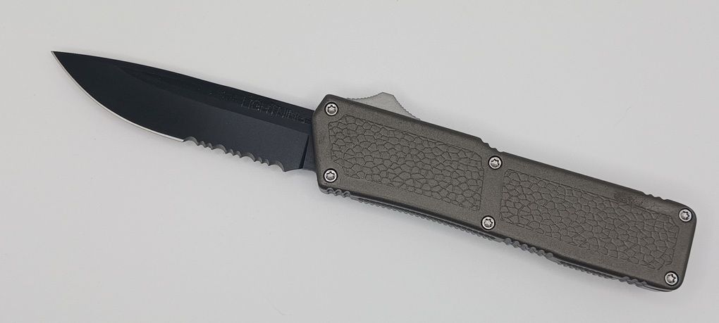 Lightning Supreme Gray D/A OTF Automatic Knife Drop Point Black Serrated. The Gray Lightning Supreme has an 8 inch total length with a 3.25 inch blade. It is a double action in and out switchblade knife. This is a taiwan version. The taiwan version was the first produced before the chinese versions came out. This version has aircraft aluminum handles and better made metal blades. The springs in these are made better than the chinese versions. It comes with a pocket clip which can be taken off.