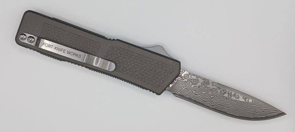 Lightning Supreme Gray D/A OTF Automatic Knife Drop Point Damascus Plain. The Gray Lightning Supreme has an 8 inch total length with a 3.25 inch blade. It is a double action in and out switchblade knife. This is a taiwan version. The taiwan version was the first produced before the chinese versions came out. This version has aircraft aluminum handles and better made metal blades. The springs in these are made better than the chinese versions. It comes with a pocket clip which can be taken off.