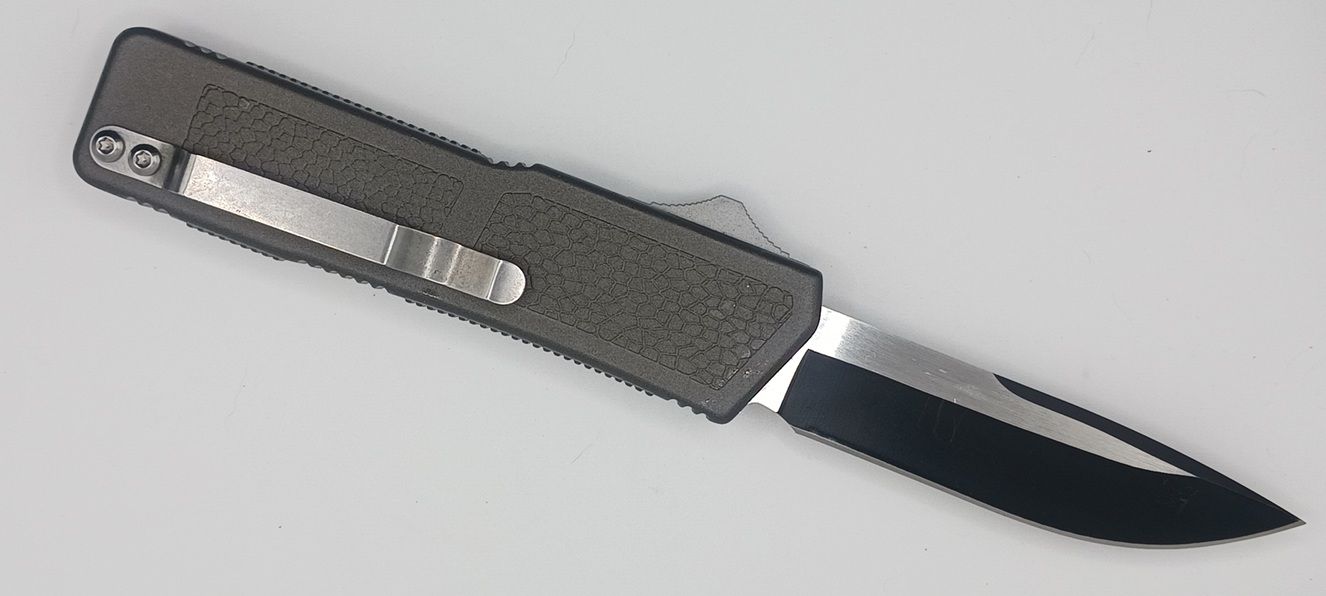 Lightning Supreme Gray D/A OTF Automatic Knife Drop Point Two Tone Plain. The Gray Lightning Supreme has an 8 inch total length with a 3.25 inch blade. It is a double action in and out switchblade knife. This is a taiwan version. The taiwan version was the first produced before the chinese versions came out. This version has aircraft aluminum handles and better made metal blades. The springs in these are made better than the chinese versions. It comes with a pocket clip which can be taken off.